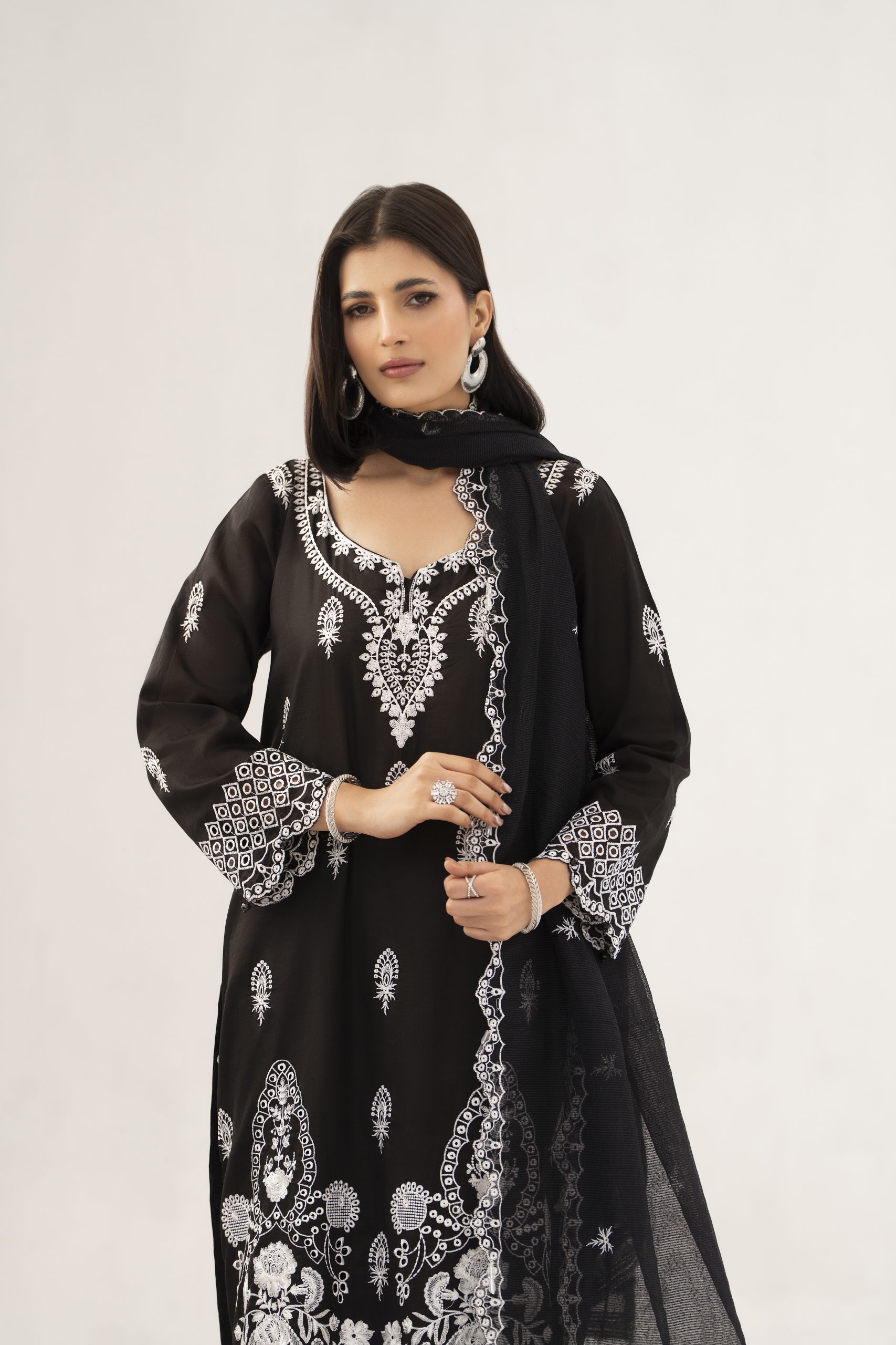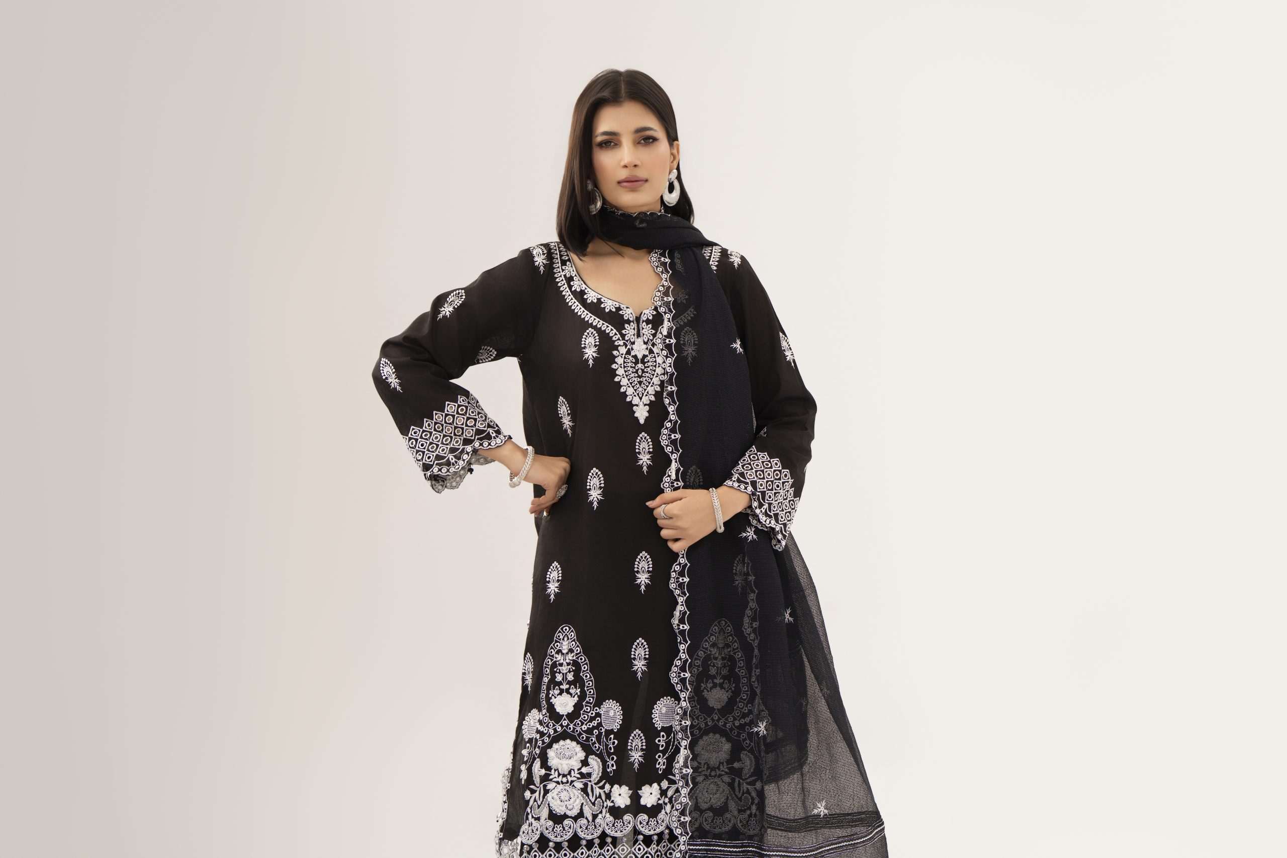 The outfit includes 2.5 meters of plain lawn trouser fabric, offering versatility in stitching according to your preferred style. Completing the ensemble is a beautifully embroidered organza net dupatta (2.5 meters), adding lightness, texture, and a touch of luxury to the overall look.