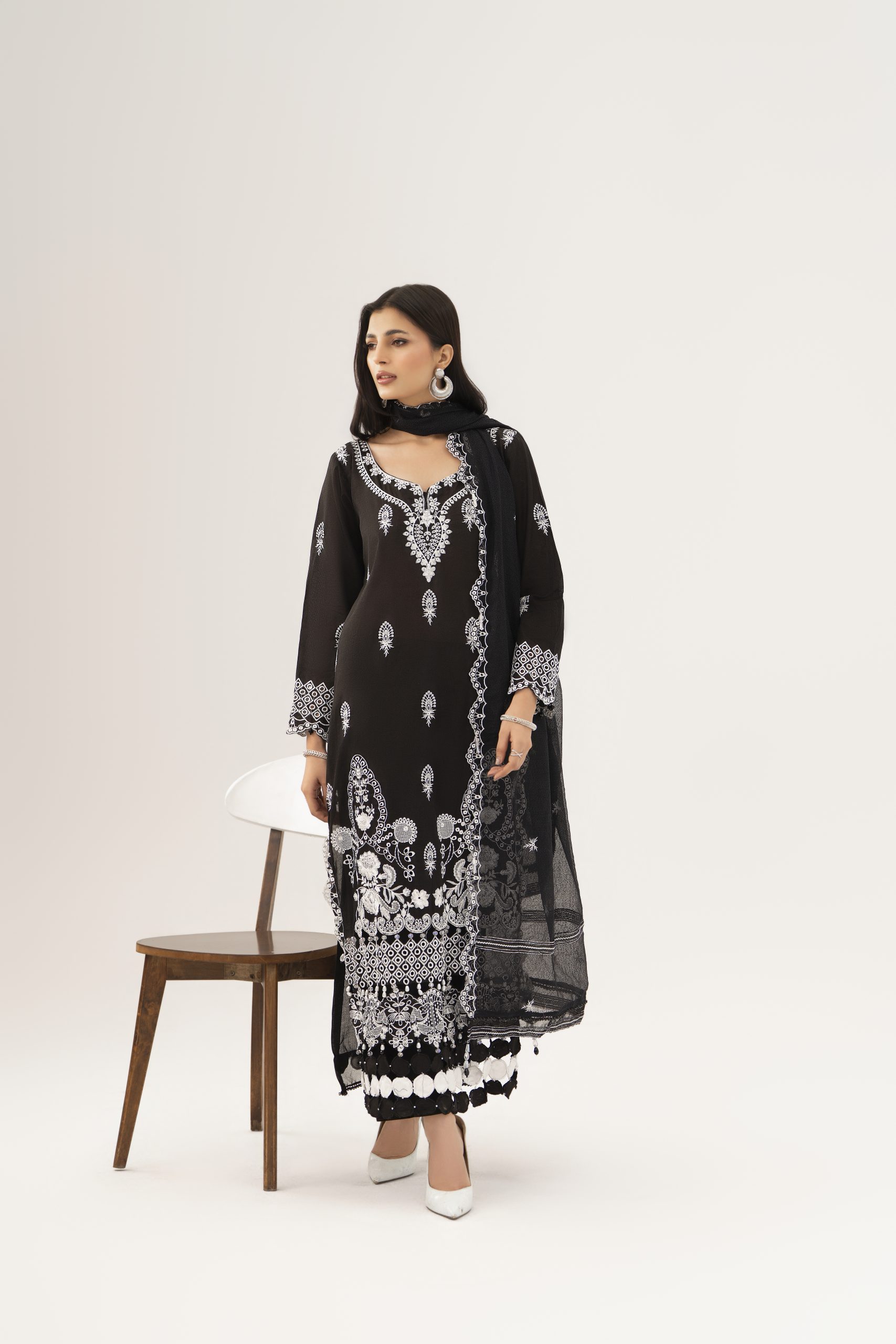 The shirt features a fully embroidered lawn front (48 inches) that serves as the highlight of the design. Intricate embroidery continues on the sleeves (26 inches), creating a cohesive and refined look. Two embroidered daman patti panels (30 inches each) enhance the hemline with structured detailing, while the embroidered side chalk patti (1.5 yards) adds definition and a tailored finish. The plain lawn back (48 inches) provides balance, allowing the embroidery to stand out elegantly.