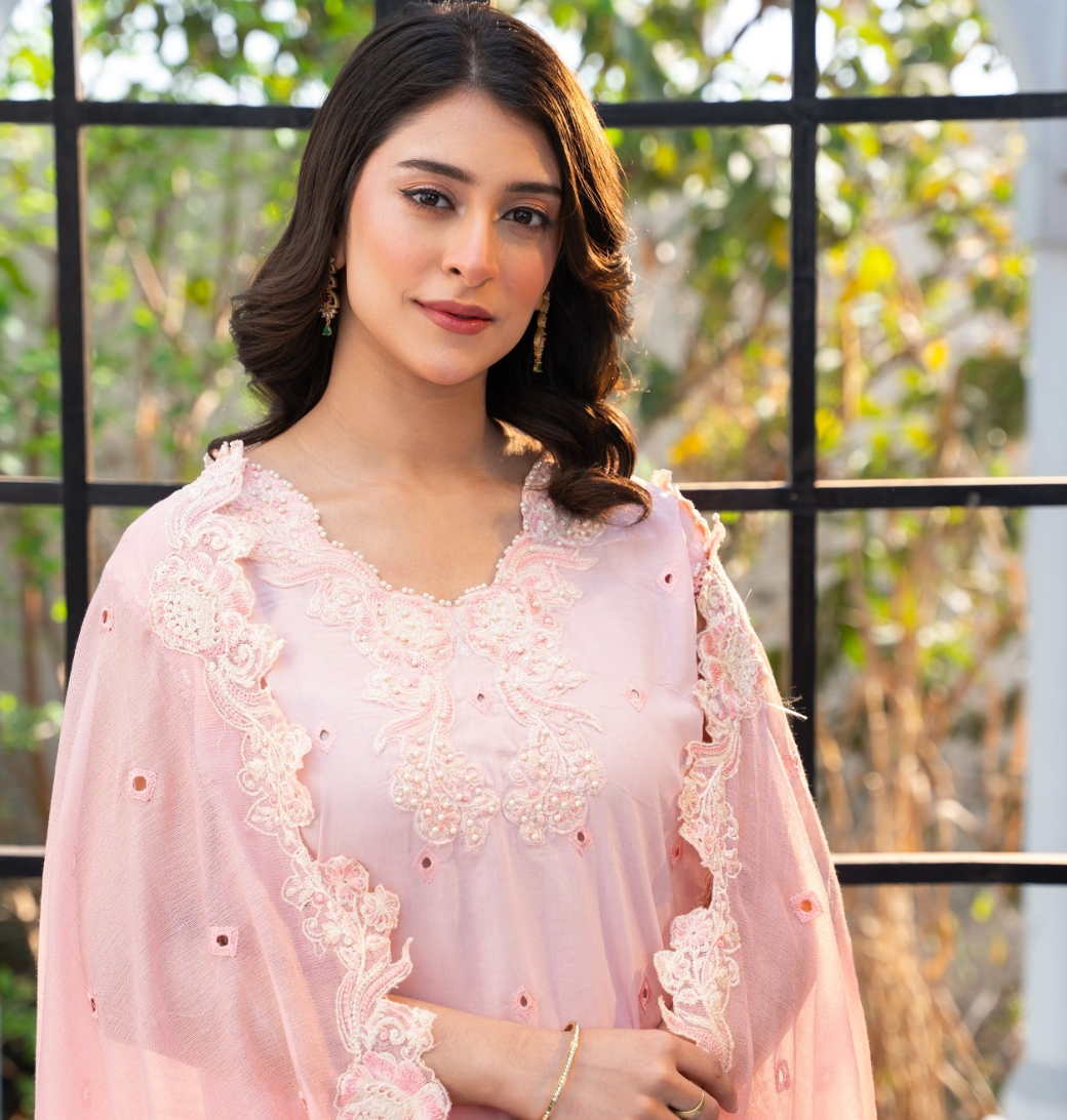 Soft Bloom is an elegant unstitched 3-piece suit featuring an embroidered front with side patches and neckline detailing. The design is complemented with a sleeve patch, paired with a plain trouser and an embroidered cotton net dupatta for a refined festive and semi-formal look.
