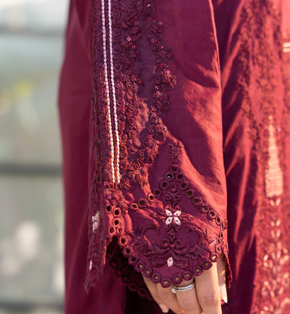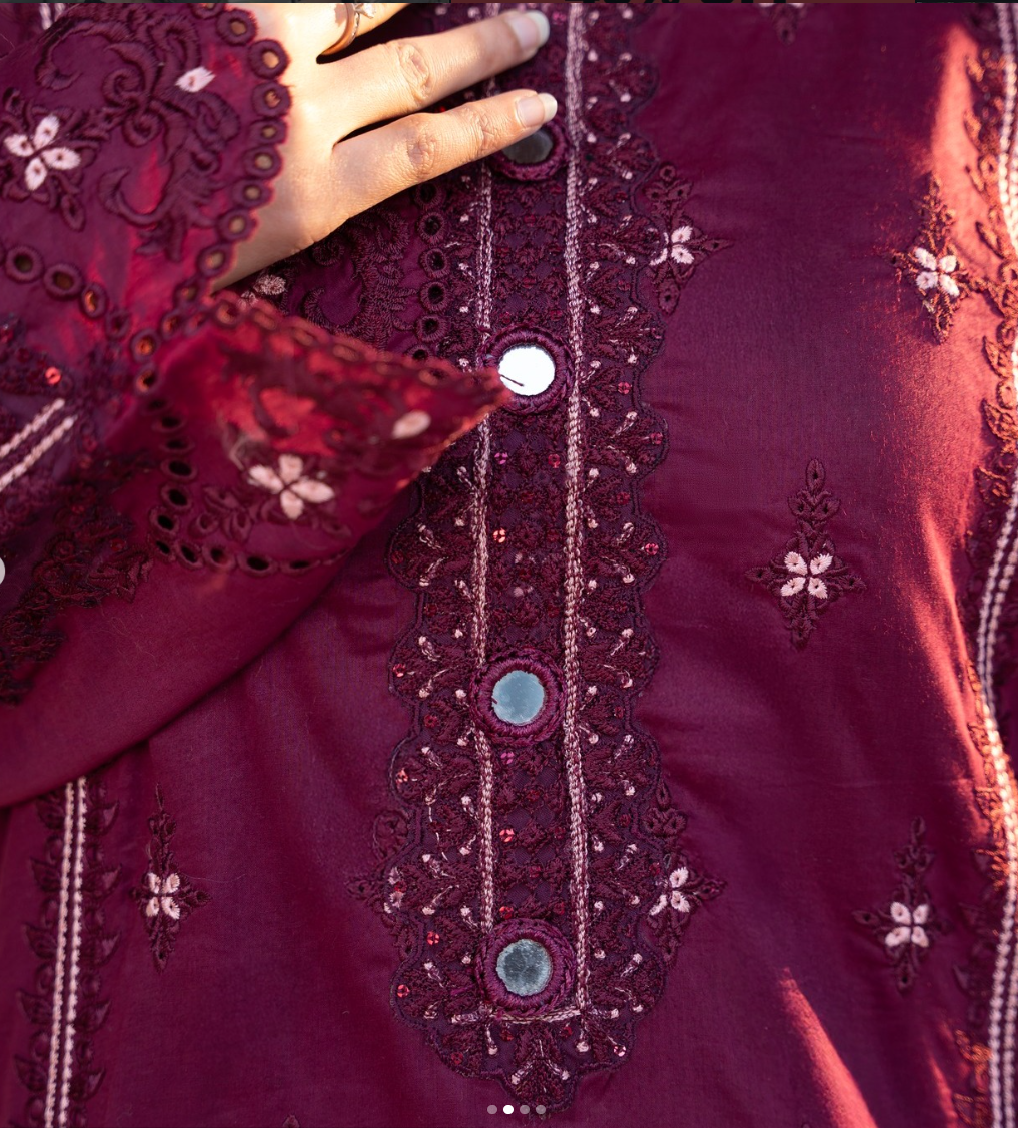 Velvet Rose is an elegant unstitched 3-piece ensemble featuring a fully embroidered front and back with refined sleeve detailing and an embroidered gala patch. The design is enhanced with embroidered chaak and sleeve patches, paired with a plain trouser and an embroidered cotton net dupatta for a graceful and sophisticated look suitable for festive and formal occasions.